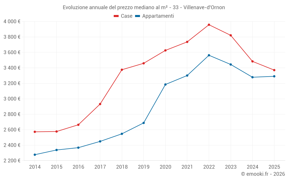 Il prezzo mediano sulle 41 transazioni di case degli ultimi 3 mesi nel comune di Villenave-d'Ornon era di 3 412 € al metro quadrato per un valore patrimoniale mediano di 280 100 €. In questo periodo il 60% delle transazioni era tra 2 474 e 4 001 € al metro quadrato (dal 2° all'8° decile).