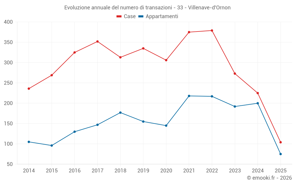 Il prezzo mediano sulle 26 transazioni di appartamenti degli ultimi 3 mesi nel comune di Villenave-d'Ornon era di 3 231 € al metro quadrato per un valore patrimoniale mediano di 157 000 €. In questo periodo il 60% delle transazioni era tra 2 800 e 3 556 € al metro quadrato (dal 2° all'8° decile).
