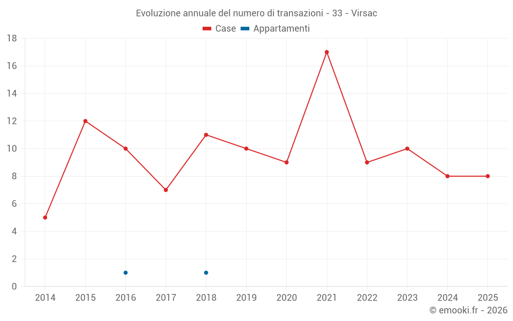Il prezzo mediano sulle 21 transazioni di case degli ultimi 24 mesi nel comune di Virsac era di 2 517 € al metro quadrato per un valore patrimoniale mediano di 264 000 €. In questo periodo il 60% delle transazioni era tra 1 896 e 2 939 € al metro quadrato (dal 2° all'8° decile).