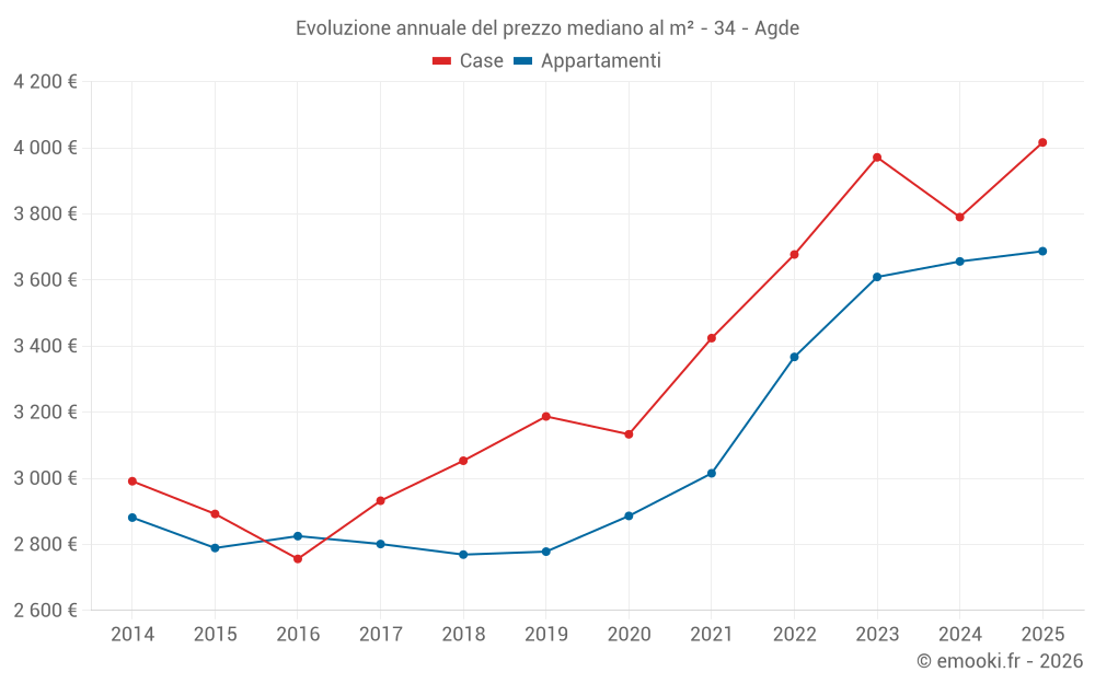 Il prezzo mediano sulle 60 transazioni di case degli ultimi 3 mesi nel comune di Agde era di 4 332 € al metro quadrato per un valore patrimoniale mediano di 255 885 €. In questo periodo il 60% delle transazioni era tra 3 032 e 5 862 € al metro quadrato (dal 2° all'8° decile).