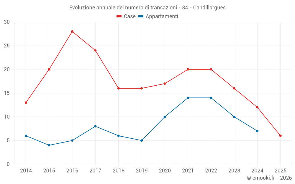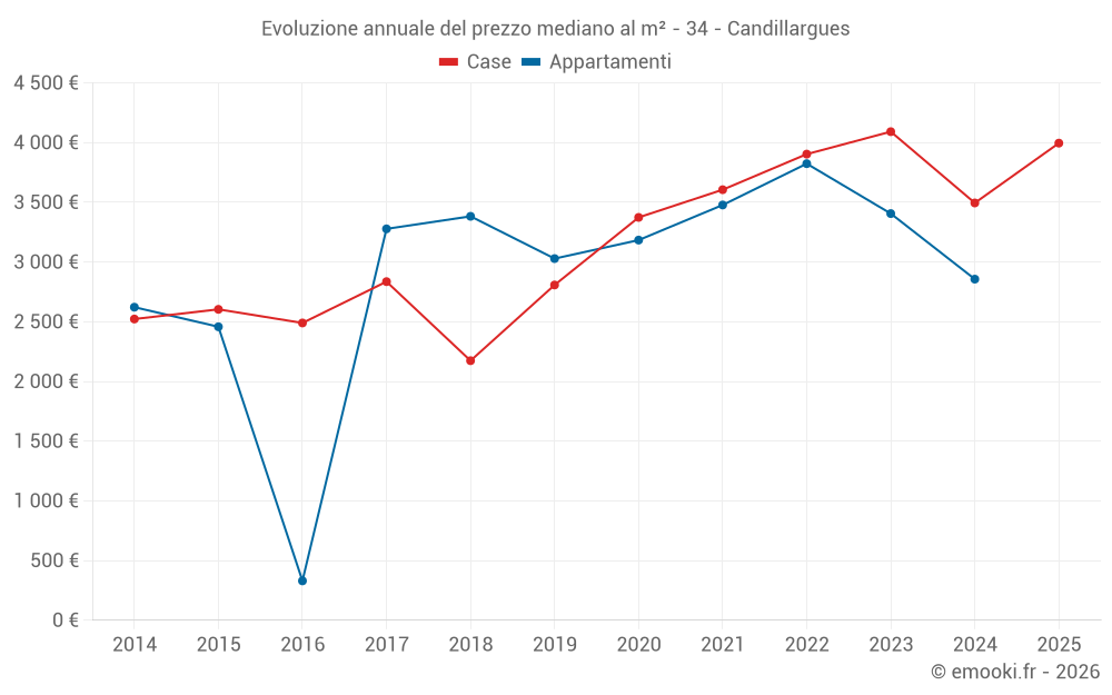 Il prezzo mediano sulle 24 transazioni di case degli ultimi 24 mesi nel comune di Candillargues era di 4 032 € al metro quadrato per un valore patrimoniale mediano di 370 100 €. In questo periodo il 60% delle transazioni era tra 3 143 e 4 619 € al metro quadrato (dal 2° all'8° decile).