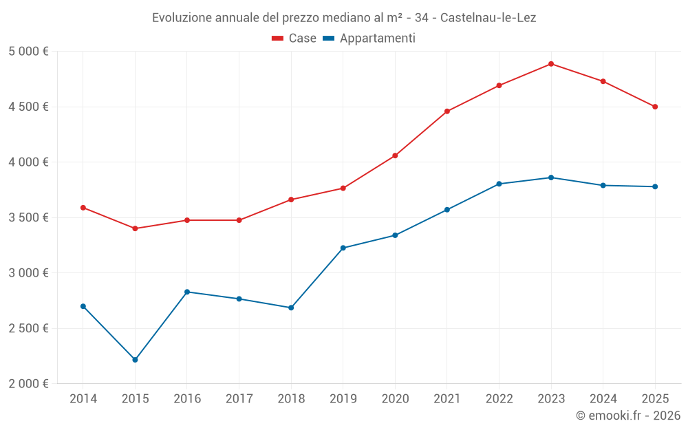 Il prezzo mediano sulle 37 transazioni di case degli ultimi 6 mesi nel comune di Castelnau-le-Lez era di 4 500 € al metro quadrato per un valore patrimoniale mediano di 490 000 €. In questo periodo il 60% delle transazioni era tra 3 881 e 5 405 € al metro quadrato (dal 2° all'8° decile).