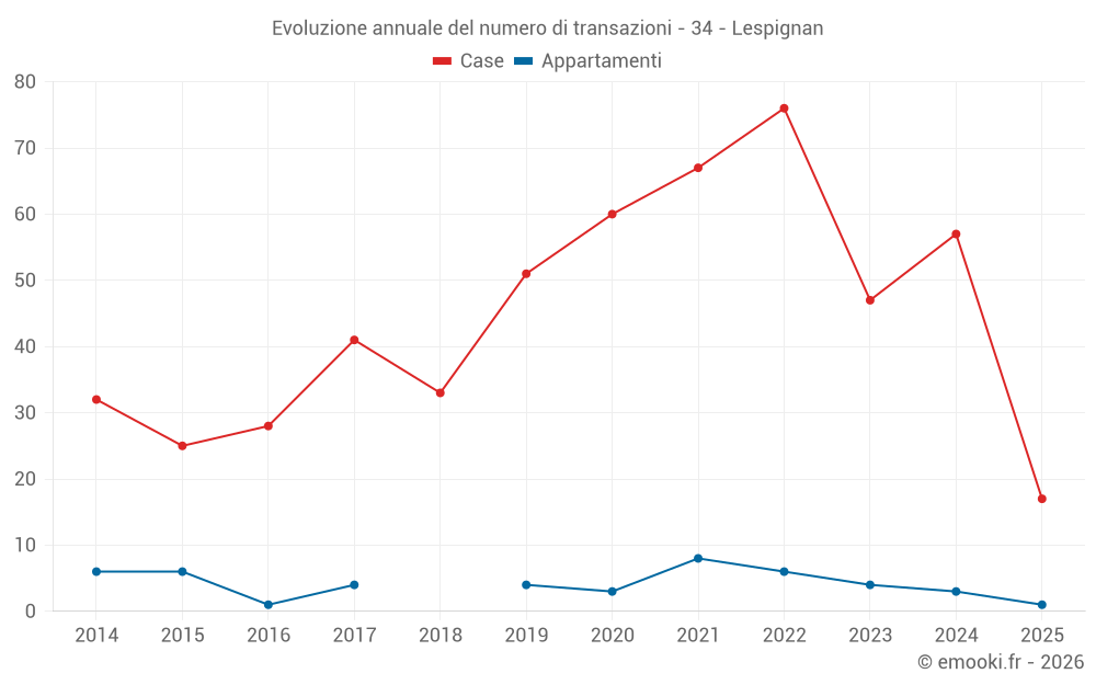 Il prezzo mediano sulle 54 transazioni di case degli ultimi 12 mesi nel comune di Lespignan era di 2 080 € al metro quadrato per un valore patrimoniale mediano di 203 750 €. In questo periodo il 60% delle transazioni era tra 1 170 e 2 776 € al metro quadrato (dal 2° all'8° decile).