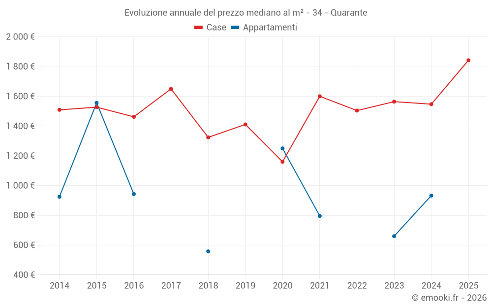 Il prezzo mediano sulle 19 transazioni di case degli ultimi 12 mesi nel comune di Quarante era di 1 801 € al metro quadrato per un valore patrimoniale mediano di 167 000 €. In questo periodo il 60% delle transazioni era tra 916 e 2 295 € al metro quadrato (dal 2° all'8° decile).