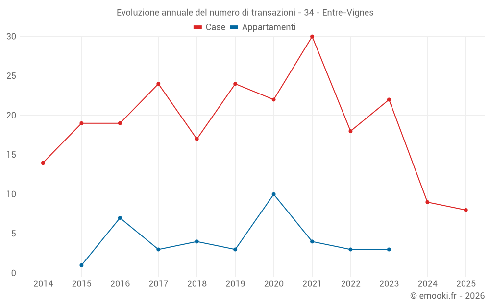 Il prezzo mediano sulle 28 transazioni di case degli ultimi 24 mesi nel comune di Entre-Vignes era di 2 970 € al metro quadrato per un valore patrimoniale mediano di 307 500 €. In questo periodo il 60% delle transazioni era tra 2 150 e 4 163 € al metro quadrato (dal 2° all'8° decile).