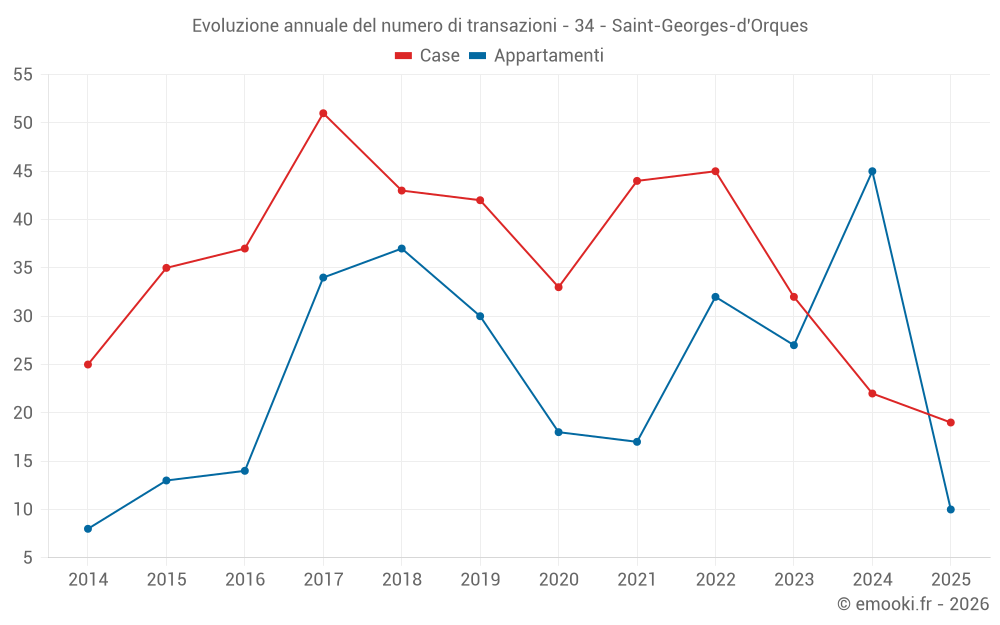 Il prezzo mediano sulle 19 transazioni di case degli ultimi 6 mesi nel comune di Saint-Georges-d'Orques era di 3 622 € al metro quadrato per un valore patrimoniale mediano di 341 000 €. In questo periodo il 60% delle transazioni era tra 2 473 e 4 321 € al metro quadrato (dal 2° all'8° decile).