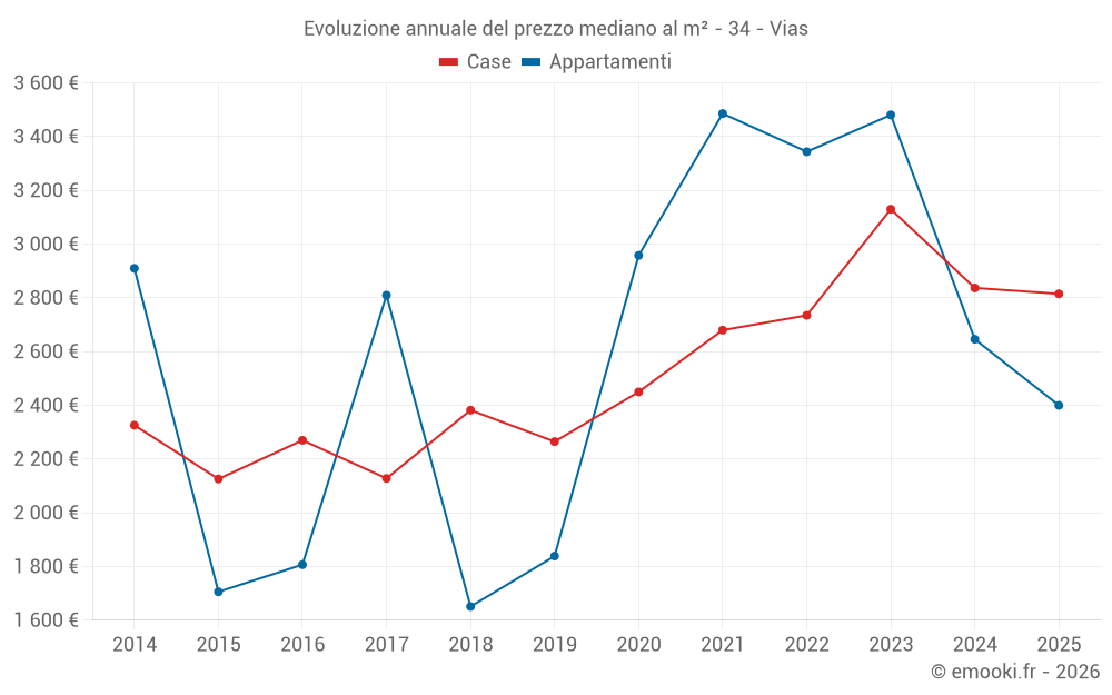 Il prezzo mediano sulle 38 transazioni di appartamenti degli ultimi 12 mesi nel comune di Vias era di 2 616 € al metro quadrato per un valore patrimoniale mediano di 165 750 €. In questo periodo il 60% delle transazioni era tra 1 630 e 4 200 € al metro quadrato (dal 2° all'8° decile).