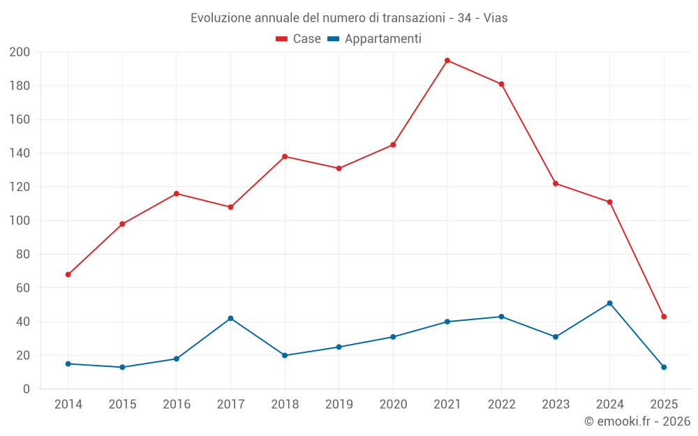 Il prezzo mediano sulle 43 transazioni di case degli ultimi 6 mesi nel comune di Vias era di 2 815 € al metro quadrato per un valore patrimoniale mediano di 205 000 €. In questo periodo il 60% delle transazioni era tra 1 700 e 3 980 € al metro quadrato (dal 2° all'8° decile).
