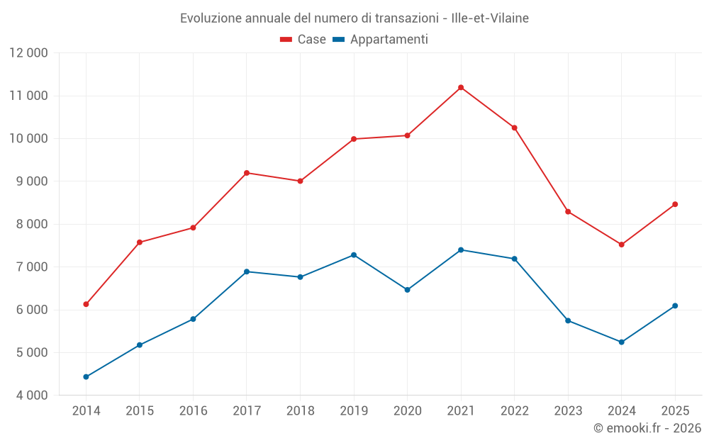 Il prezzo mediano sulle 2204 transazioni di case degli ultimi 3 mesi nel dipartimento di Ille-et-Vilaine era di 2 359 € al metro quadrato per un valore patrimoniale mediano di 240 000 €. In questo periodo il 60% delle transazioni era tra 1 595 e 3 354 € al metro quadrato (dal 2° all'8° decile).