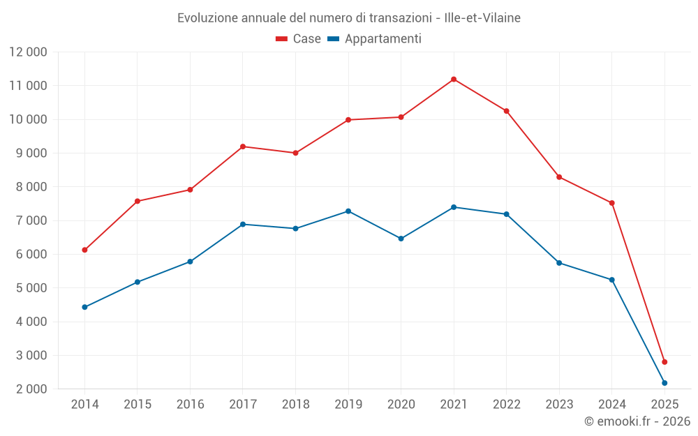 Il prezzo mediano sulle 743 transazioni di appartamenti degli ultimi 3 mesi nel dipartimento di Ille-et-Vilaine era di 3 354 € al metro quadrato per un valore patrimoniale mediano di 168 590 €. In questo periodo il 60% delle transazioni era tra 2 373 e 4 745 € al metro quadrato (dal 2° all'8° decile).