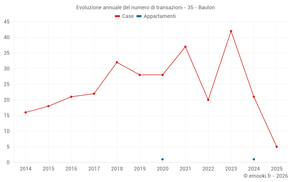 Il prezzo mediano sulle 18 transazioni di case degli ultimi 12 mesi nel comune di Baulon era di 2 257 € al metro quadrato per un valore patrimoniale mediano di 192 500 €. In questo periodo il 60% delle transazioni era tra 1 470 e 2 627 € al metro quadrato (dal 2° all'8° decile).