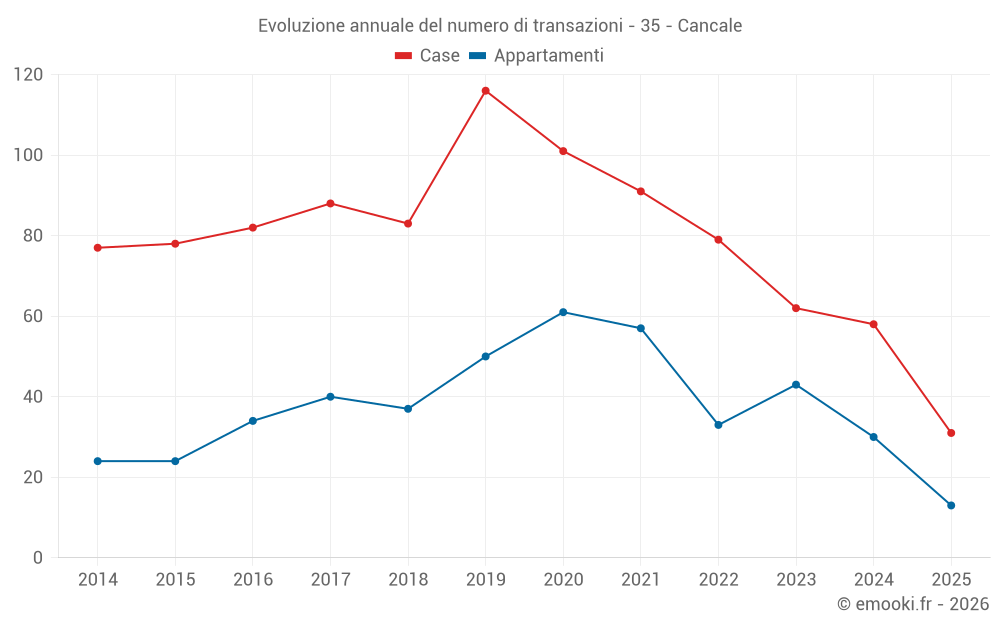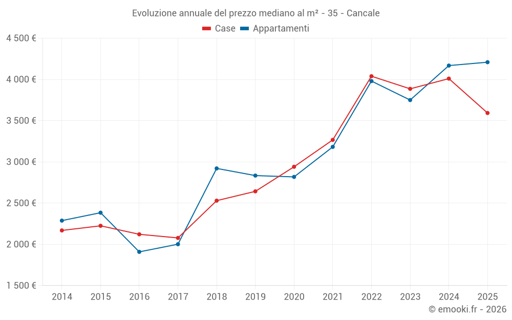 Il prezzo mediano sulle 31 transazioni di case degli ultimi 6 mesi nel comune di Cancale era di 3 593 € al metro quadrato per un valore patrimoniale mediano di 340 000 €. In questo periodo il 60% delle transazioni era tra 2 870 e 4 615 € al metro quadrato (dal 2° all'8° decile).