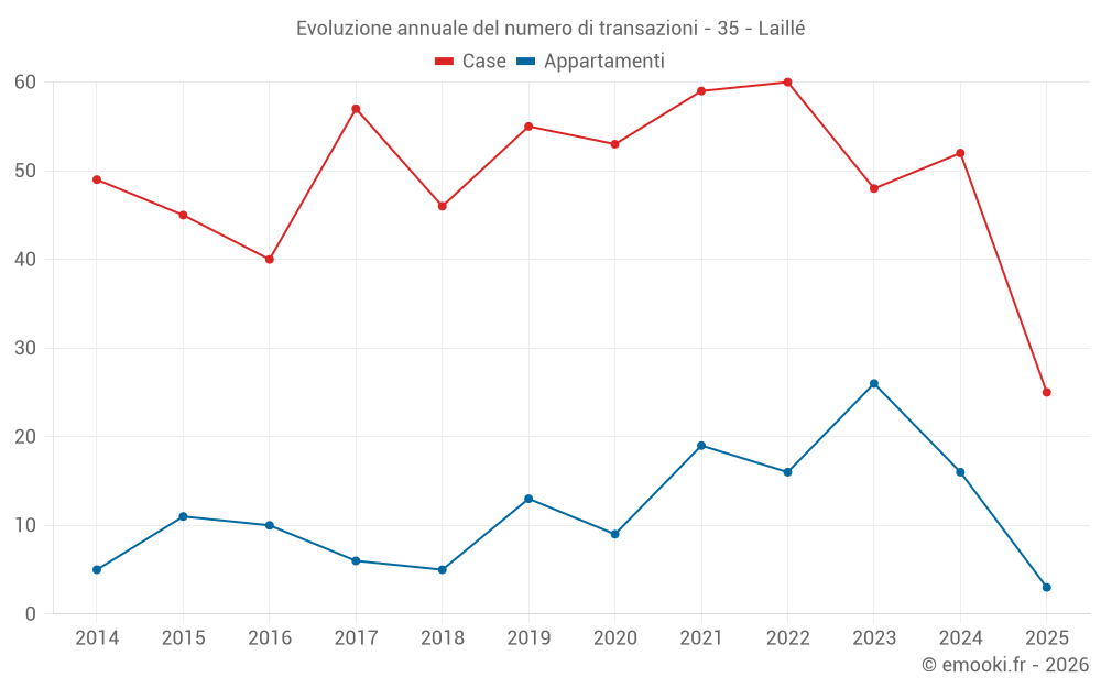 Il prezzo mediano sulle 25 transazioni di case degli ultimi 6 mesi nel comune di Laillé era di 2 733 € al metro quadrato per un valore patrimoniale mediano di 358 000 €. In questo periodo il 60% delle transazioni era tra 2 521 e 3 057 € al metro quadrato (dal 2° all'8° decile).
