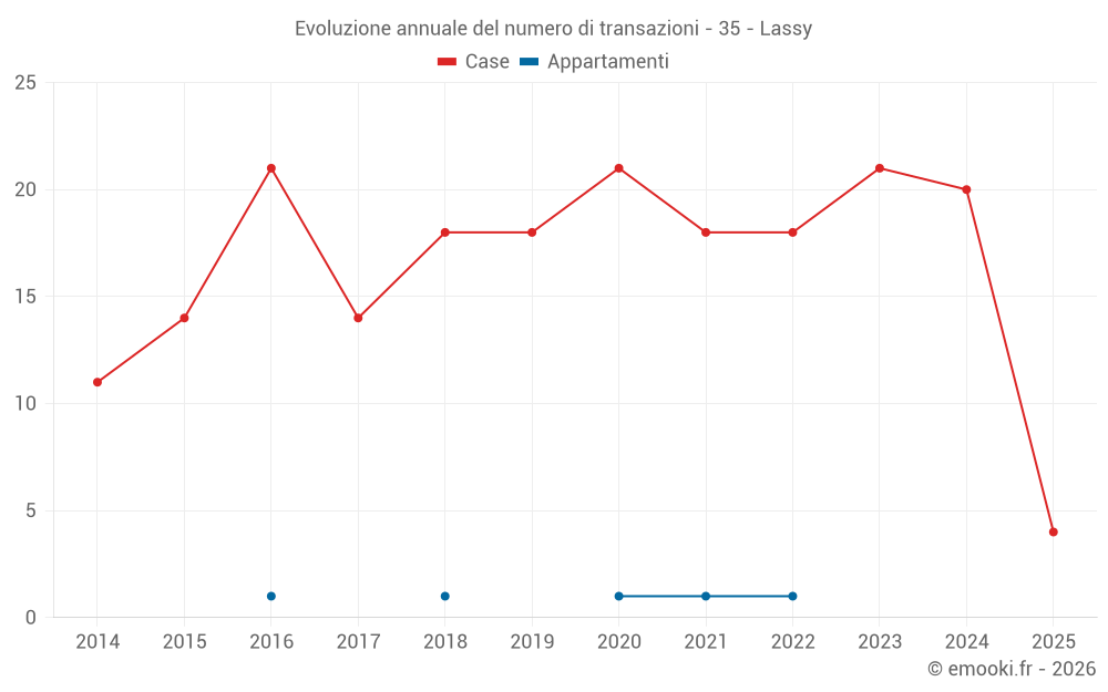 Il prezzo mediano sulle 33 transazioni di case degli ultimi 24 mesi nel comune di Lassy era di 2 152 € al metro quadrato per un valore patrimoniale mediano di 229 500 €. In questo periodo il 60% delle transazioni era tra 1 537 e 2 822 € al metro quadrato (dal 2° all'8° decile).