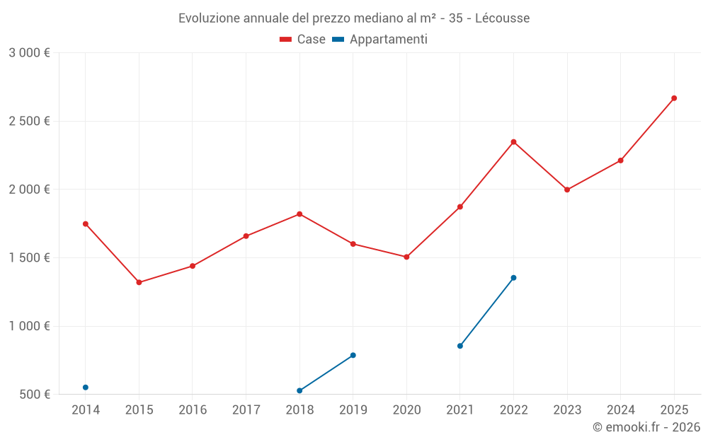 Il prezzo mediano sulle 35 transazioni di case degli ultimi 12 mesi nel comune di Lécousse era di 2 278 € al metro quadrato per un valore patrimoniale mediano di 218 000 €. In questo periodo il 60% delle transazioni era tra 1 907 e 2 975 € al metro quadrato (dal 2° all'8° decile).