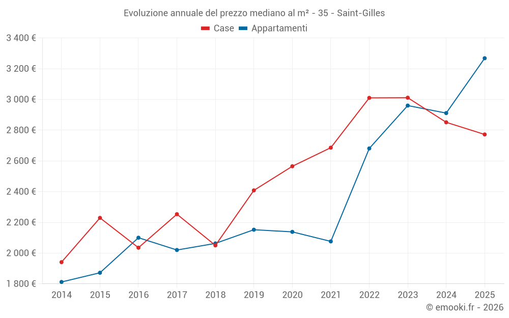 Il prezzo mediano sulle 22 transazioni di appartamenti degli ultimi 24 mesi nel comune di Saint-Gilles era di 3 103 € al metro quadrato per un valore patrimoniale mediano di 200 500 €. In questo periodo il 60% delle transazioni era tra 2 911 e 3 301 € al metro quadrato (dal 2° all'8° decile).