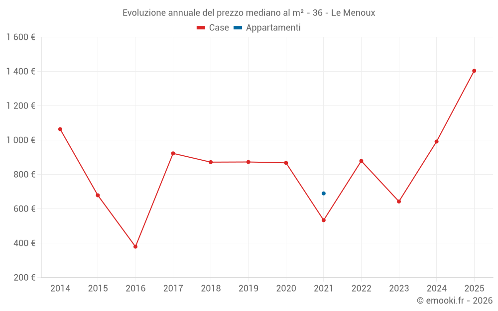 Il prezzo mediano sulle 14 transazioni di case degli ultimi 24 mesi nel comune di Le Menoux era di 944 € al metro quadrato per un valore patrimoniale mediano di 80 500 €. In questo periodo il 60% delle transazioni era tra 364 e 1 383 € al metro quadrato (dal 2° all'8° decile).