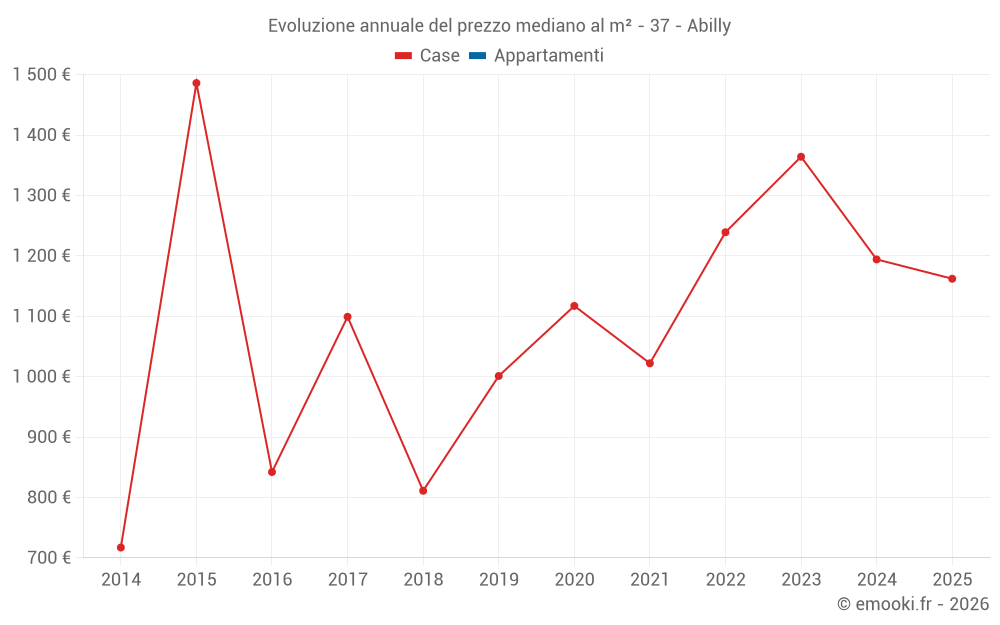 Il prezzo mediano sulle 22 transazioni di case degli ultimi 24 mesi nel comune di Abilly era di 1 184 € al metro quadrato per un valore patrimoniale mediano di 135 500 €. In questo periodo il 60% delle transazioni era tra 1 003 e 1 809 € al metro quadrato (dal 2° all'8° decile).