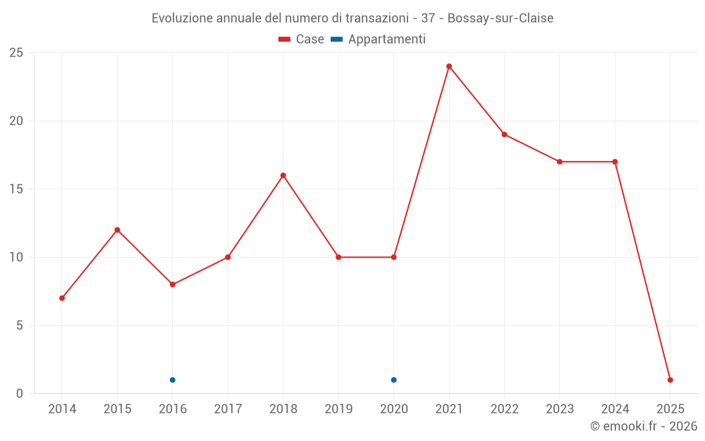 Il prezzo mediano sulle 30 transazioni di case degli ultimi 24 mesi nel comune di Bossay-sur-Claise era di 962 € al metro quadrato per un valore patrimoniale mediano di 105 250 €. In questo periodo il 60% delle transazioni era tra 489 e 1 365 € al metro quadrato (dal 2° all'8° decile).