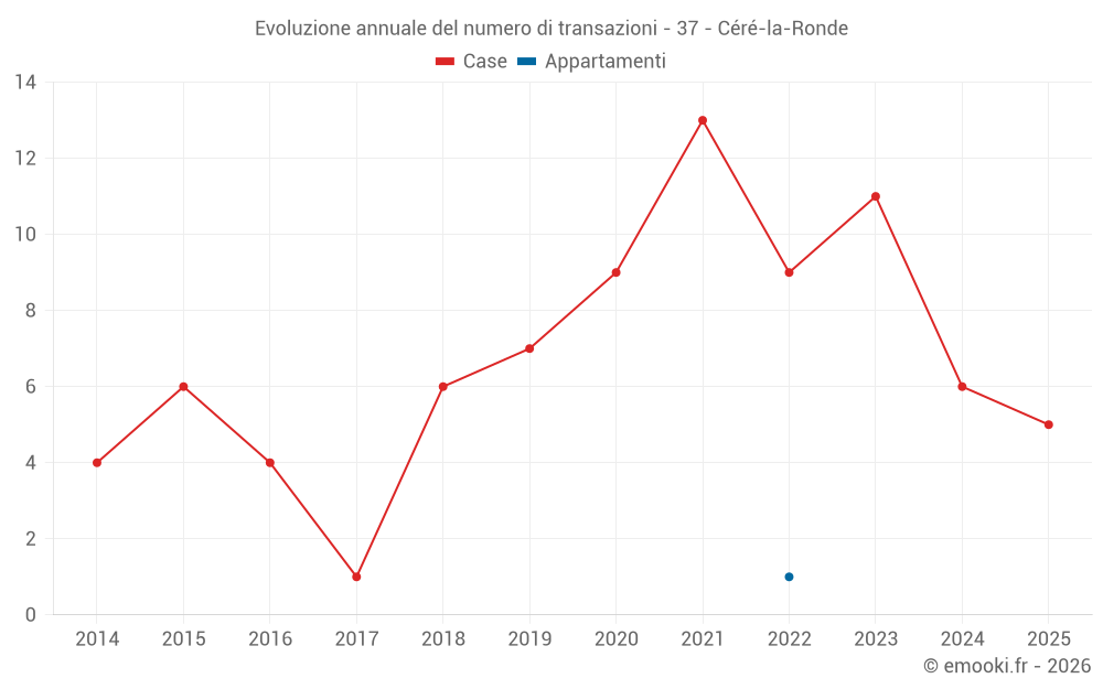 Il prezzo mediano sulle 20 transazioni di case degli ultimi 24 mesi nel comune di Céré-la-Ronde era di 1 566 € al metro quadrato per un valore patrimoniale mediano di 140 500 €. In questo periodo il 60% delle transazioni era tra 844 e 2 315 € al metro quadrato (dal 2° all'8° decile).