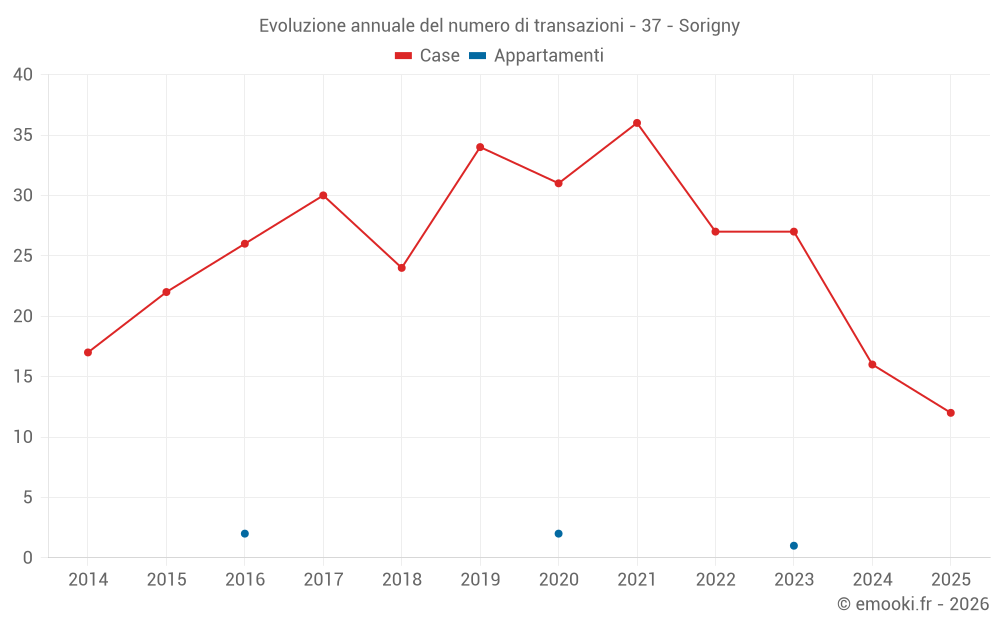 Il prezzo mediano sulle 22 transazioni di case degli ultimi 12 mesi nel comune di Sorigny era di 2 333 € al metro quadrato per un valore patrimoniale mediano di 250 000 €. In questo periodo il 60% delle transazioni era tra 1 823 e 2 915 € al metro quadrato (dal 2° all'8° decile).