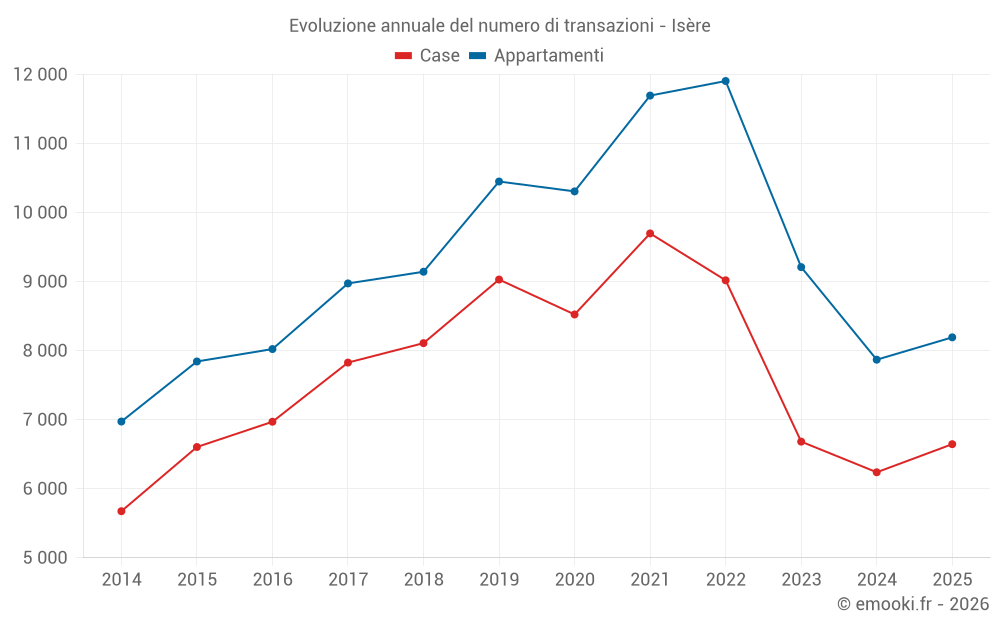 Il prezzo mediano sulle 1509 transazioni di appartamenti degli ultimi 3 mesi nel dipartimento di Isère era di 2 506 € al metro quadrato per un valore patrimoniale mediano di 149 000 €. In questo periodo il 60% delle transazioni era tra 1 794 e 3 492 € al metro quadrato (dal 2° all'8° decile).
