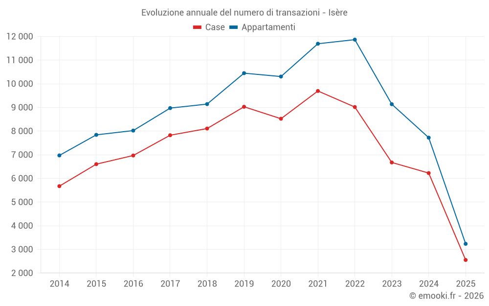 Il prezzo mediano sulle 1042 transazioni di case degli ultimi 3 mesi nel dipartimento di Isère era di 2 755 € al metro quadrato per un valore patrimoniale mediano di 271 075 €. In questo periodo il 60% delle transazioni era tra 1 856 e 3 667 € al metro quadrato (dal 2° all'8° decile).