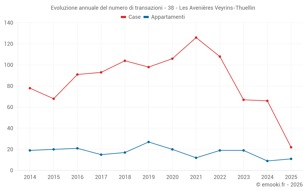 Il prezzo mediano sulle 22 transazioni di case degli ultimi 6 mesi nel comune di Les Avenières Veyrins-Thuellin era di 2 448 € al metro quadrato per un valore patrimoniale mediano di 218 295 €. In questo periodo il 60% delle transazioni era tra 1 984 e 2 979 € al metro quadrato (dal 2° all'8° decile).