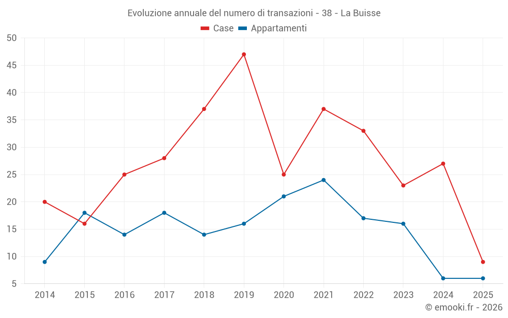 Il prezzo mediano sulle 22 transazioni di case degli ultimi 12 mesi nel comune di La Buisse era di 3 000 € al metro quadrato per un valore patrimoniale mediano di 291 650 €. In questo periodo il 60% delle transazioni era tra 1 626 e 4 137 € al metro quadrato (dal 2° all'8° decile).