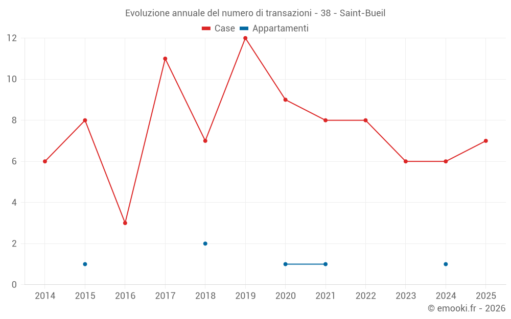 Il prezzo mediano sulle 16 transazioni di case degli ultimi 24 mesi nel comune di Saint-Bueil era di 2 216 € al metro quadrato per un valore patrimoniale mediano di 212 100 €. In questo periodo il 60% delle transazioni era tra 1 797 e 2 814 € al metro quadrato (dal 2° all'8° decile).