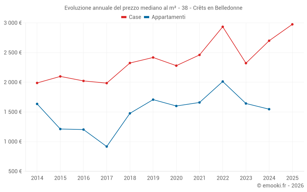 Il prezzo mediano sulle 34 transazioni di case degli ultimi 12 mesi nel comune di Crêts en Belledonne era di 2 826 € al metro quadrato per un valore patrimoniale mediano di 273 550 €. In questo periodo il 60% delle transazioni era tra 2 233 e 3 569 € al metro quadrato (dal 2° all'8° decile).