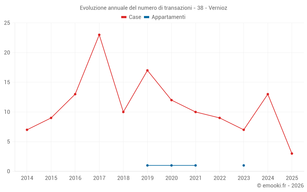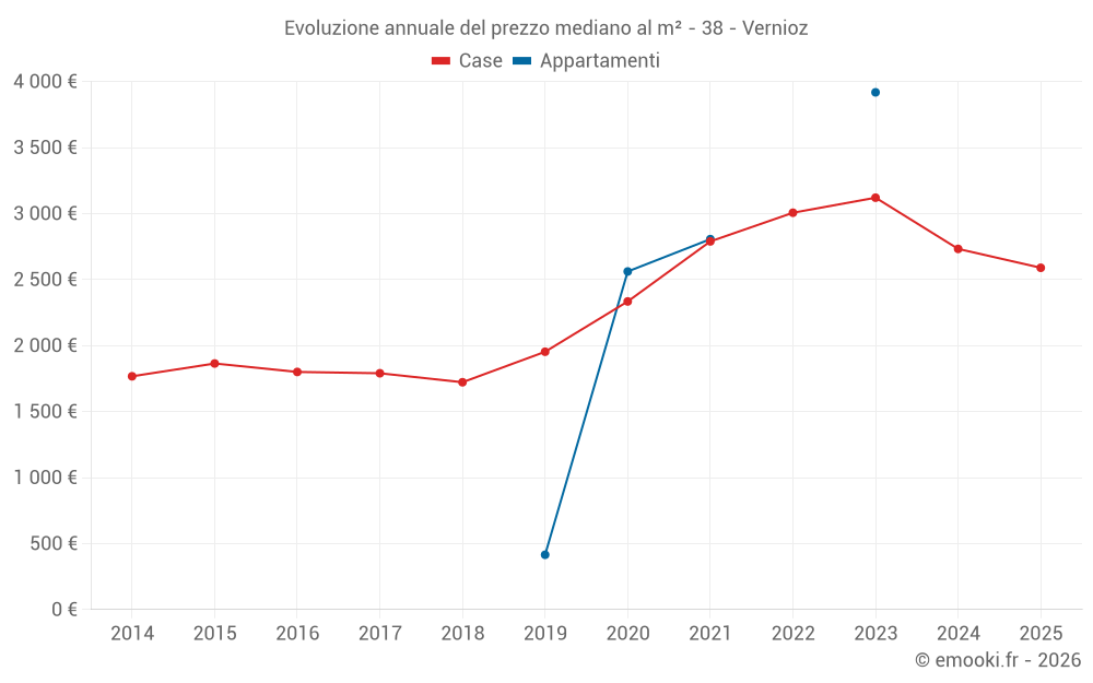 Il prezzo mediano sulle 21 transazioni di case degli ultimi 24 mesi nel comune di Vernioz era di 2 780 € al metro quadrato per un valore patrimoniale mediano di 350 000 €. In questo periodo il 60% delle transazioni era tra 2 349 e 3 393 € al metro quadrato (dal 2° all'8° decile).