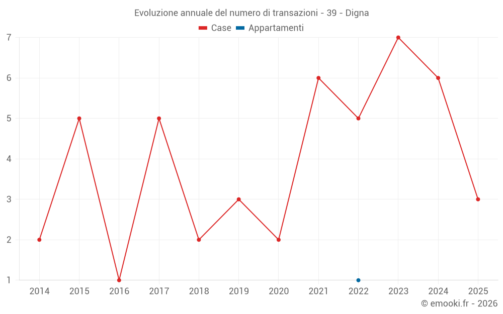 Il prezzo mediano sulle 14 transazioni di case degli ultimi 24 mesi nel comune di Digna era di 1 657 € al metro quadrato per un valore patrimoniale mediano di 145 000 €. In questo periodo il 60% delle transazioni era tra 1 374 e 2 032 € al metro quadrato (dal 2° all'8° decile).