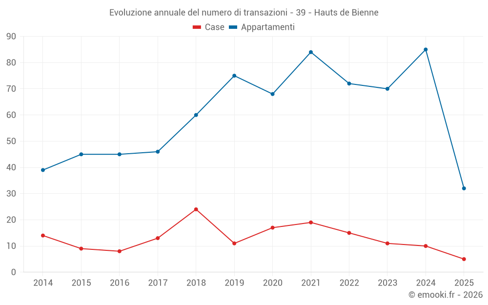 Il prezzo mediano sulle 32 transazioni di appartamenti degli ultimi 6 mesi nel comune di Hauts de Bienne era di 1 112 € al metro quadrato per un valore patrimoniale mediano di 89 100 €. In questo periodo il 60% delle transazioni era tra 709 e 1 428 € al metro quadrato (dal 2° all'8° decile).