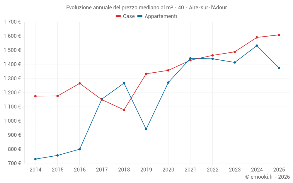 Il prezzo mediano sulle 35 transazioni di case degli ultimi 6 mesi nel comune di Aire-sur-l'Adour era di 1 608 € al metro quadrato per un valore patrimoniale mediano di 165 000 €. In questo periodo il 60% delle transazioni era tra 1 000 e 2 077 € al metro quadrato (dal 2° all'8° decile).