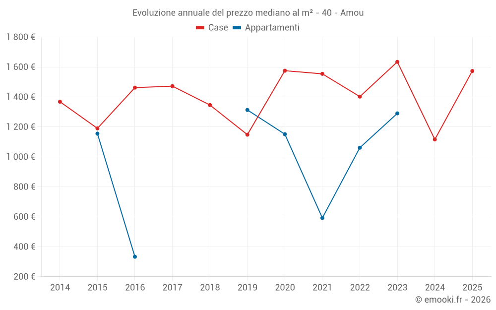 Il prezzo mediano sulle 23 transazioni di case degli ultimi 12 mesi nel comune di Amou era di 1 449 € al metro quadrato per un valore patrimoniale mediano di 140 500 €. In questo periodo il 60% delle transazioni era tra 879 e 2 331 € al metro quadrato (dal 2° all'8° decile).