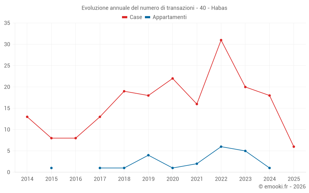 Il prezzo mediano sulle 18 transazioni di case degli ultimi 12 mesi nel comune di Habas era di 1 912 € al metro quadrato per un valore patrimoniale mediano di 182 600 €. In questo periodo il 60% delle transazioni era tra 1 321 e 2 530 € al metro quadrato (dal 2° all'8° decile).