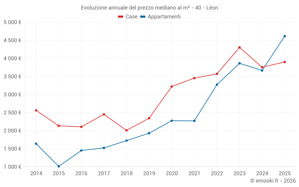 Il prezzo mediano sulle 21 transazioni di case degli ultimi 6 mesi nel comune di Léon era di 3 903 € al metro quadrato per un valore patrimoniale mediano di 390 000 €. In questo periodo il 60% delle transazioni era tra 3 429 e 4 898 € al metro quadrato (dal 2° all'8° decile).