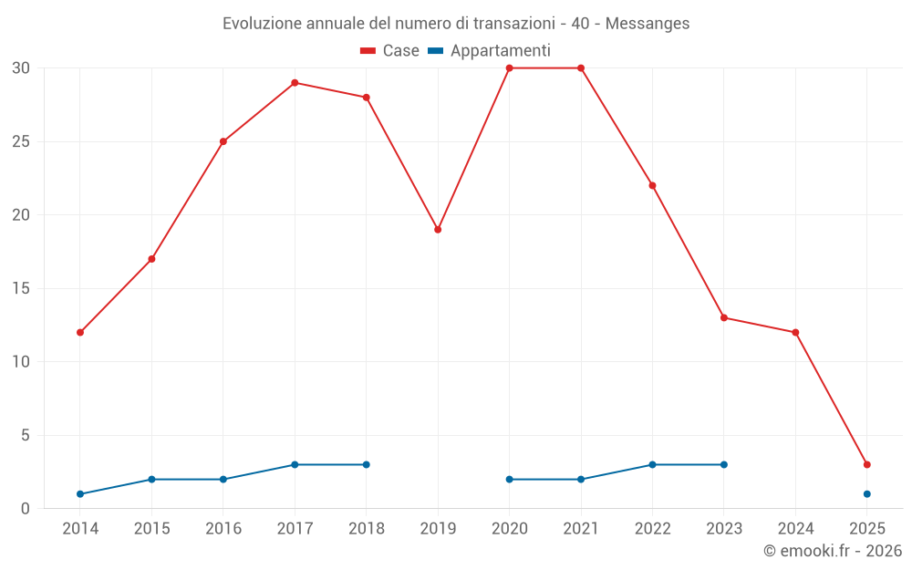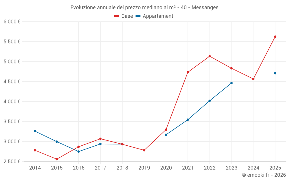 Il prezzo mediano sulle 21 transazioni di case degli ultimi 24 mesi nel comune di Messanges era di 4 761 € al metro quadrato per un valore patrimoniale mediano di 445 000 €. In questo periodo il 60% delle transazioni era tra 3 732 e 6 061 € al metro quadrato (dal 2° all'8° decile).