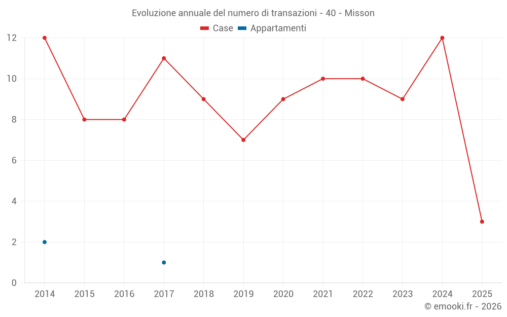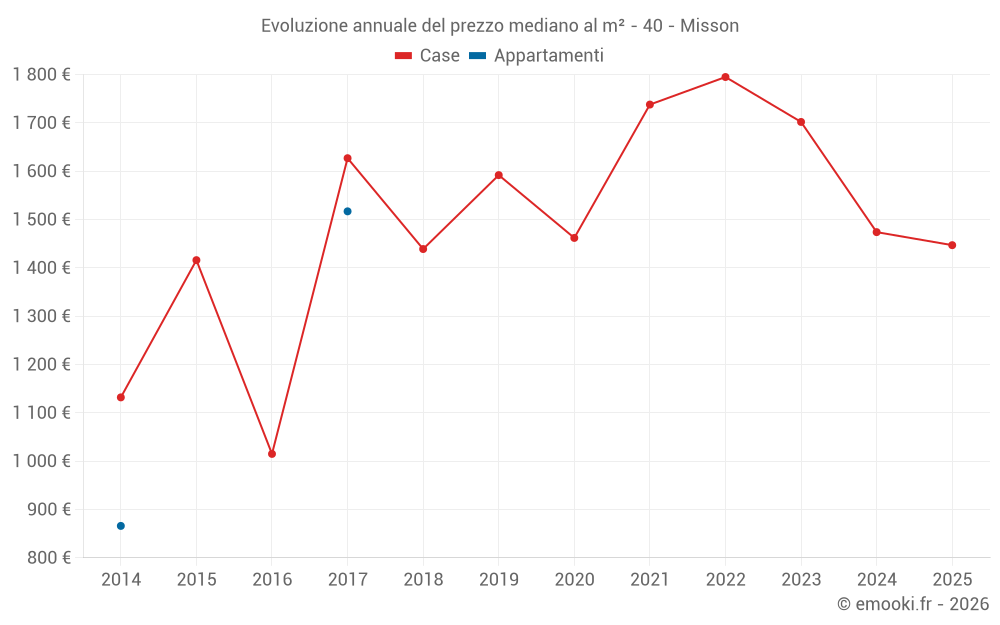 Il prezzo mediano sulle 19 transazioni di case degli ultimi 24 mesi nel comune di Misson era di 1 474 € al metro quadrato per un valore patrimoniale mediano di 217 000 €. In questo periodo il 60% delle transazioni era tra 1 018 e 1 914 € al metro quadrato (dal 2° all'8° decile).