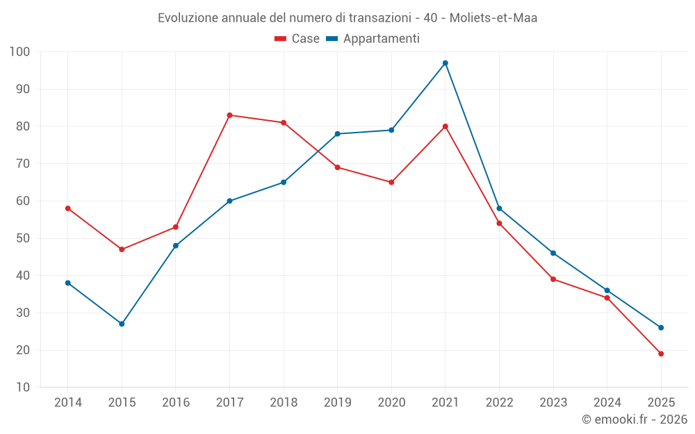 Il prezzo mediano sulle 19 transazioni di case degli ultimi 6 mesi nel comune di Moliets-et-Maa era di 5 777 € al metro quadrato per un valore patrimoniale mediano di 286 990 €. In questo periodo il 60% delle transazioni era tra 3 947 e 7 288 € al metro quadrato (dal 2° all'8° decile).