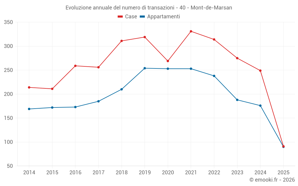 Il prezzo mediano sulle 39 transazioni di case degli ultimi 3 mesi nel comune di Mont-de-Marsan era di 2 089 € al metro quadrato per un valore patrimoniale mediano di 178 000 €. In questo periodo il 60% delle transazioni era tra 1 563 e 2 444 € al metro quadrato (dal 2° all'8° decile).