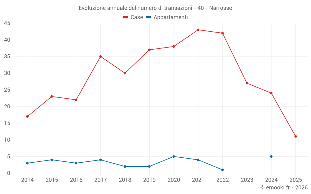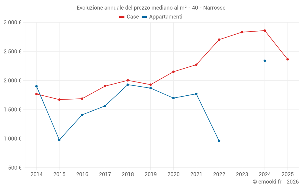 Il prezzo mediano sulle 23 transazioni di case degli ultimi 12 mesi nel comune di Narrosse era di 2 606 € al metro quadrato per un valore patrimoniale mediano di 286 000 €. In questo periodo il 60% delle transazioni era tra 1 734 e 3 204 € al metro quadrato (dal 2° all'8° decile).