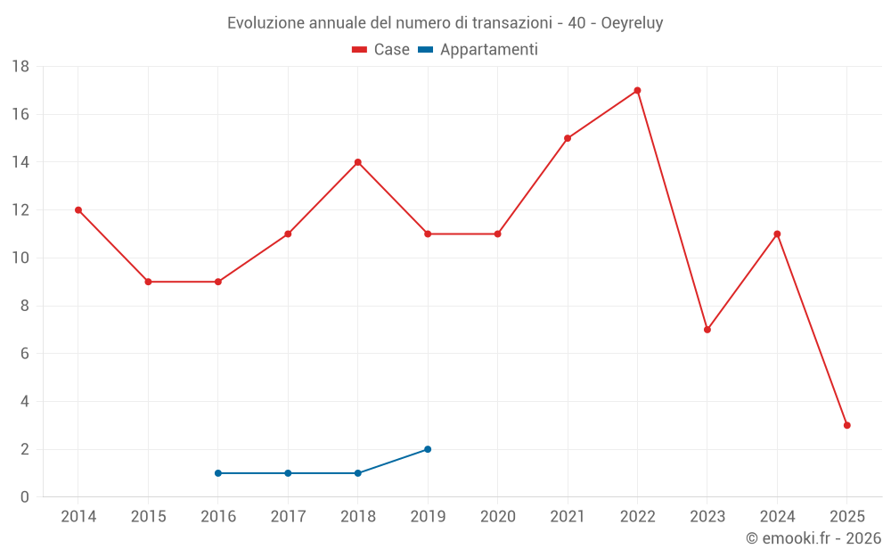 Il prezzo mediano sulle 19 transazioni di case degli ultimi 24 mesi nel comune di Oeyreluy era di 2 752 € al metro quadrato per un valore patrimoniale mediano di 281 000 €. In questo periodo il 60% delle transazioni era tra 2 267 e 3 183 € al metro quadrato (dal 2° all'8° decile).