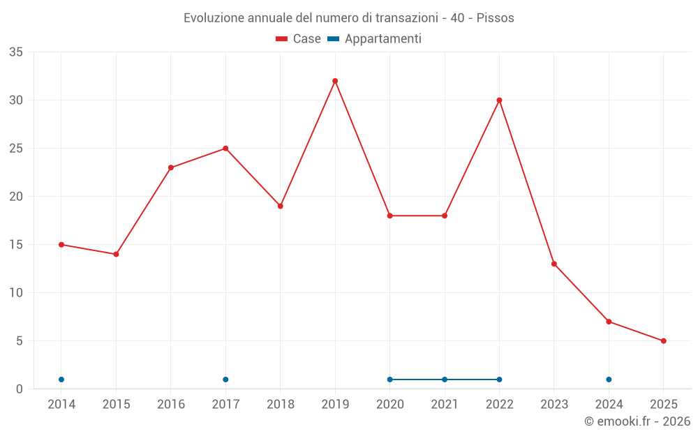 Il prezzo mediano sulle 19 transazioni di case degli ultimi 24 mesi nel comune di Pissos era di 2 400 € al metro quadrato per un valore patrimoniale mediano di 300 000 €. In questo periodo il 60% delle transazioni era tra 1 489 e 3 166 € al metro quadrato (dal 2° all'8° decile).
