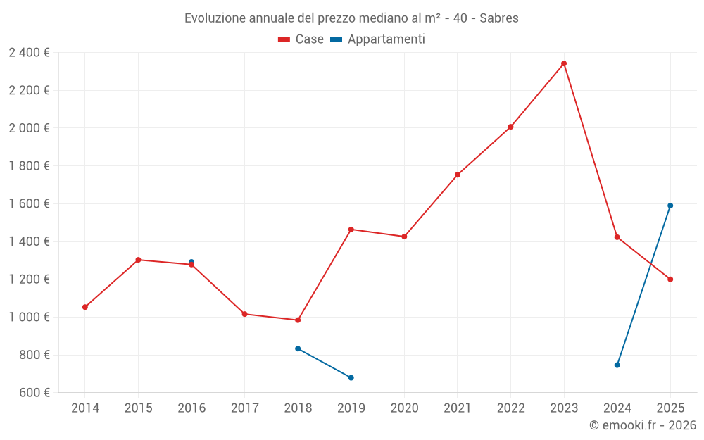 Il prezzo mediano sulle 17 transazioni di case degli ultimi 24 mesi nel comune di Sabres era di 1 753 € al metro quadrato per un valore patrimoniale mediano di 156 000 €. In questo periodo il 60% delle transazioni era tra 1 178 e 2 658 € al metro quadrato (dal 2° all'8° decile).