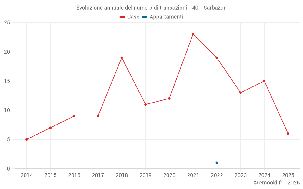 Il prezzo mediano sulle 30 transazioni di case degli ultimi 24 mesi nel comune di Sarbazan era di 1 692 € al metro quadrato per un valore patrimoniale mediano di 151 000 €. In questo periodo il 60% delle transazioni era tra 1 390 e 1 866 € al metro quadrato (dal 2° all'8° decile).