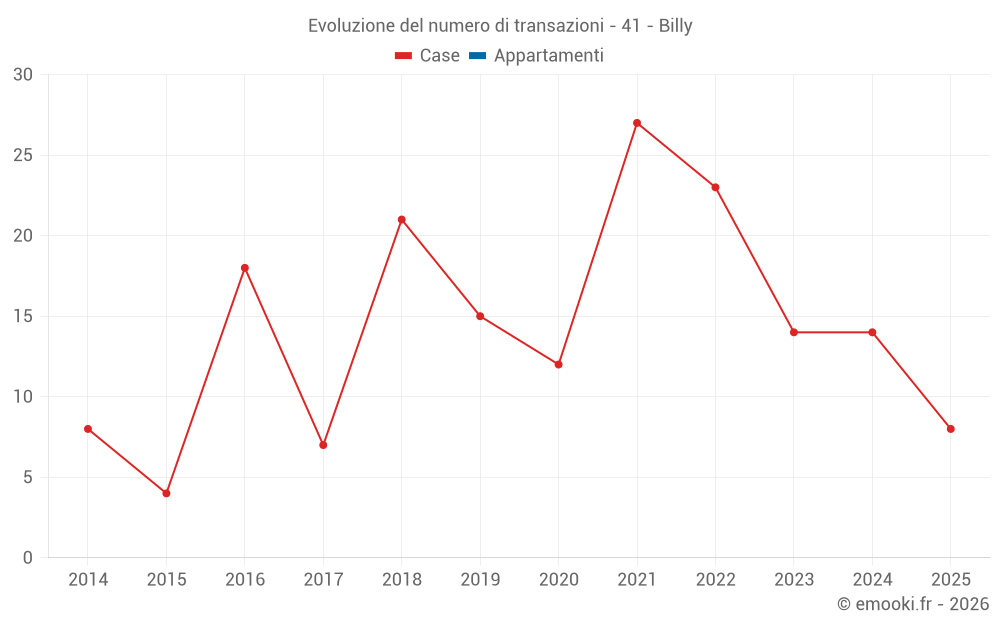 Il prezzo mediano sulle 28 transazioni di case degli ultimi 24 mesi nel comune di Billy era di 1 344 € al metro quadrato per un valore patrimoniale mediano di 119 000 €. In questo periodo il 60% delle transazioni era tra 936 e 1 686 € al metro quadrato (dal 2° all'8° decile).