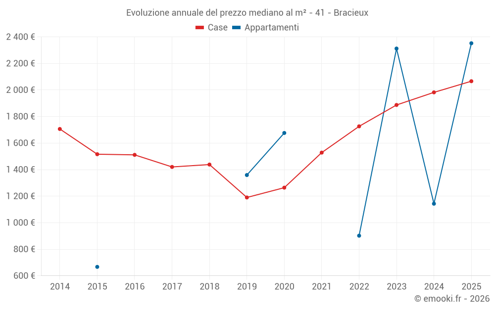 Il prezzo mediano sulle 18 transazioni di case degli ultimi 12 mesi nel comune di Bracieux era di 2 061 € al metro quadrato per un valore patrimoniale mediano di 179 950 €. In questo periodo il 60% delle transazioni era tra 1 296 e 2 547 € al metro quadrato (dal 2° all'8° decile).