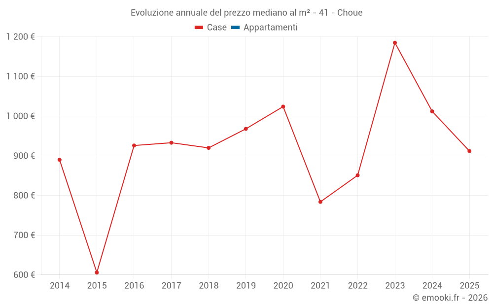 Il prezzo mediano sulle 17 transazioni di case degli ultimi 24 mesi nel comune di Choue era di 1 011 € al metro quadrato per un valore patrimoniale mediano di 95 000 €. In questo periodo il 60% delle transazioni era tra 801 e 1 257 € al metro quadrato (dal 2° all'8° decile).